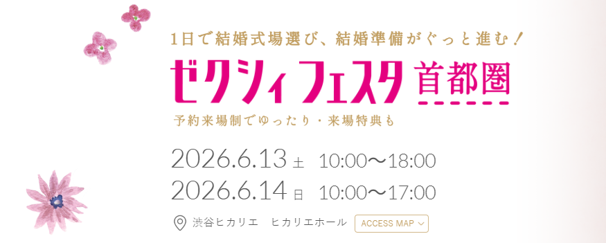 | 首都圏 ゼクシィフェスタ | <6月> 13日(土)、14日(日) | 渋谷駅直結 | ・QUOカード全員プレゼント ・オリジナル巾着トート ・その他、豪華賞品抽選会アリ! |