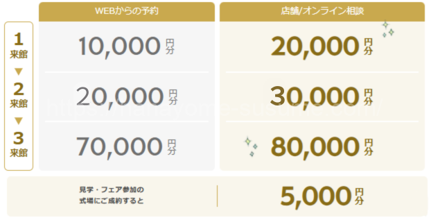 最大金額を貰うためには、成約までに【3会場以上の見学】が必要なので、様々な式場を比較するためにも3会場以上見学へ行くのがおすすめです。