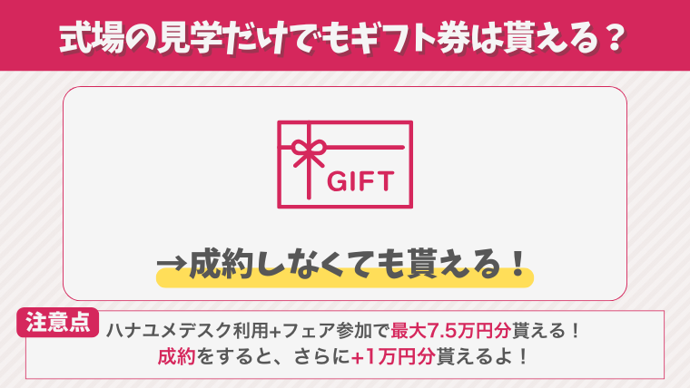 というように、ハナユメを経由して見学した式場で成約をしなくても最大7.5万円分の電子マネーギフトが貰えます。