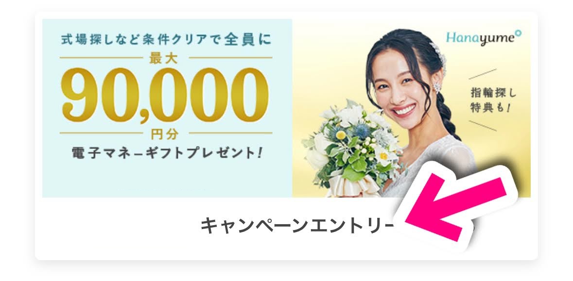 ハナユメのキャンペーンは、ハナユメを通してブライダルフェアに参加・成約等することで最大85,000円分の電子マネーギフトが貰えます。