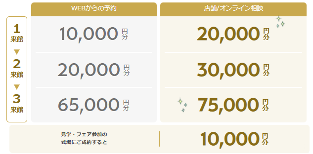 最大金額を貰うためには、成約までに【3会場以上の見学】が必要なので、様々な式場を比較するためにも3会場以上見学へ行くのがおすすめです。