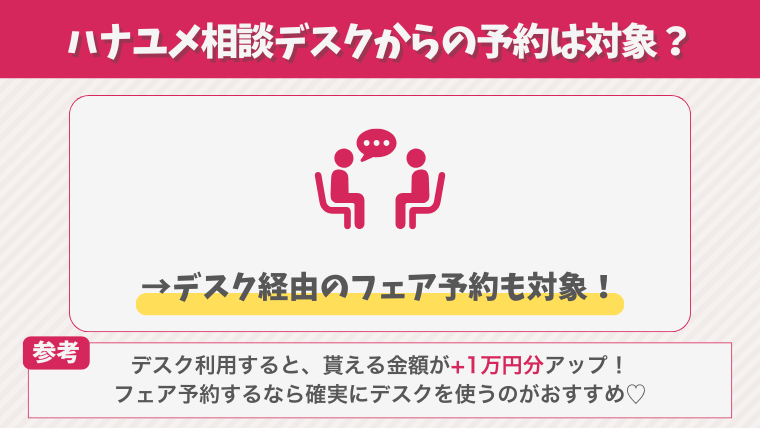 ハナユメウエディングデスクからフェアを予約した場合でも、キャンペーンの対象となります。