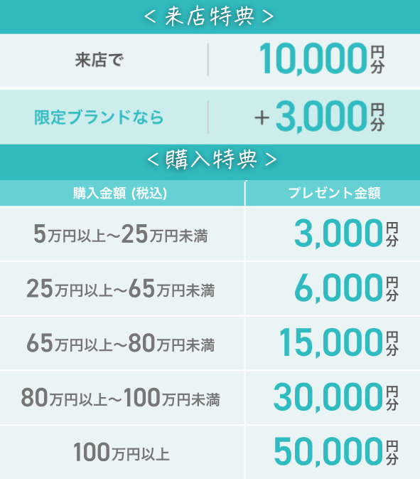 指輪探し特典 | <来店特典> ・リングショップへの予約&来店で1万円分の電子マネーギフト +限定ブランドショップへの予約&来店で+3,000円分 <購入特典> ・リング購入で購入金額に応じて最大5万円分の電子マネーギフト 5万円以上~25万円未満…3,000円分 25万円以上~65万円未満…6,000円分 65万円以上~80万円未満…15,000円分 80万円以上~100万円未満…30,000円分 100万円以上…50,000円分 |