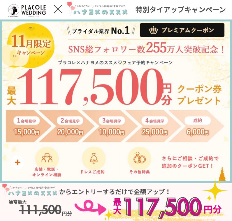 現在、プラコレでは当サイト限定タイアップキャンペーン最大117,500円分のクーポンが貰えるキャンペーンを実施中です。(通常は最大111,500円分)