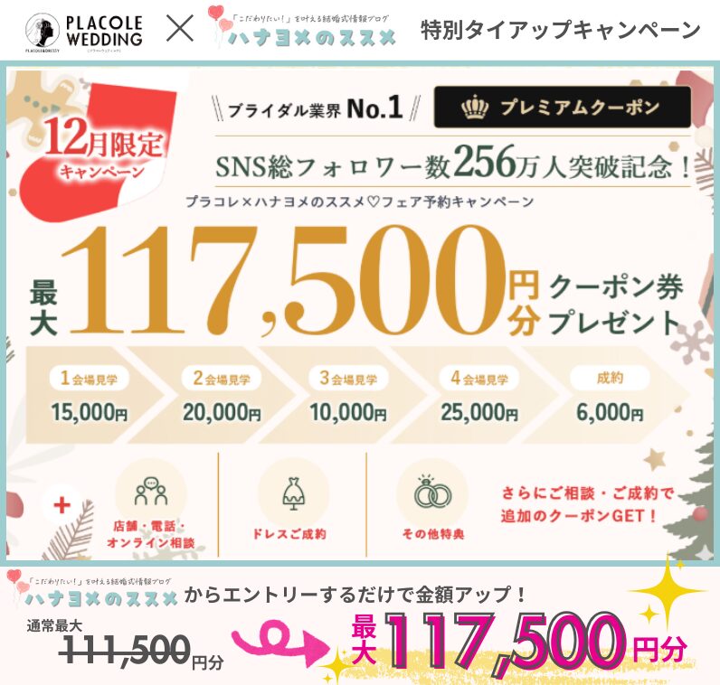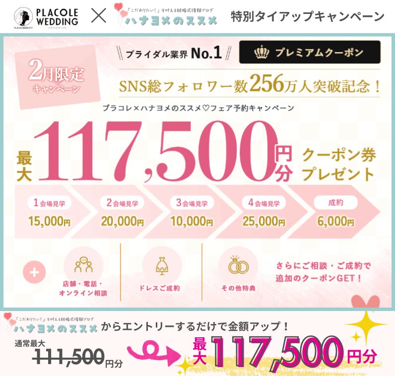 最後に、プラコレウェディングのお得なキャンペーン内容をもう一度紹介します。