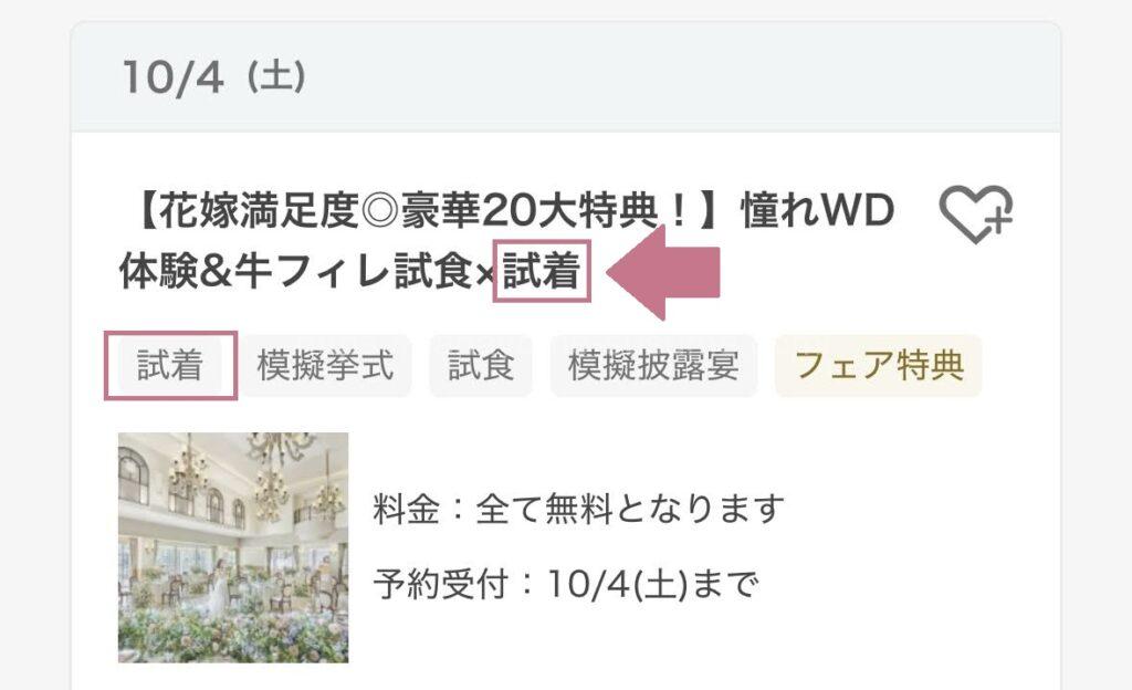 ドレス試着ができるフェアは、フェア名やタグに「試着」と書いてあるのが目印です。↓