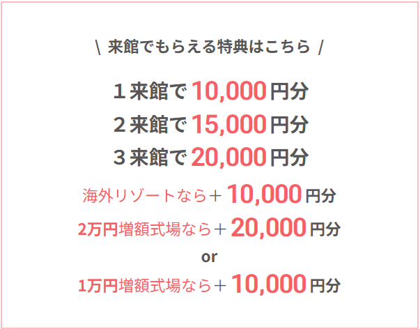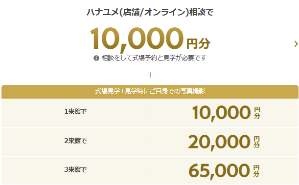 」といった式場予約サイトでは、式場見学等の条件をクリアすることでギフト券が貰えるキャンペーンを実施しています。