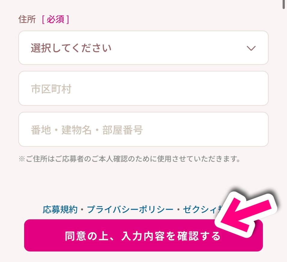 まず、キャンペーンページのエントリーフォームに、メールアドレスや住所を入力し、「同意の上、入力内容を確認する」というボタンを押します。