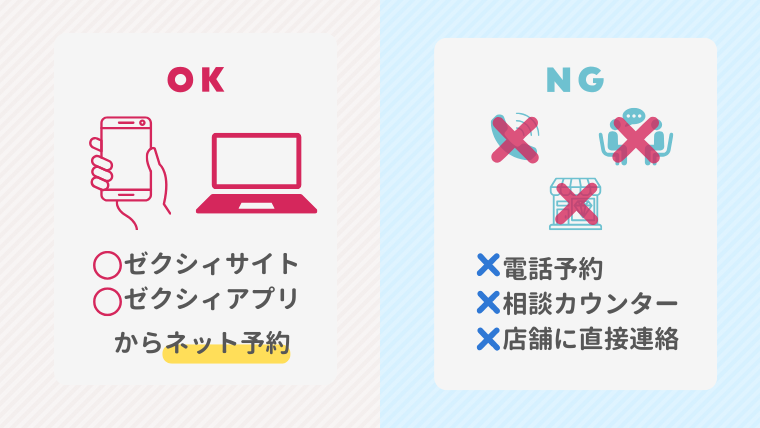 等、ゼクシィの公式サイト又はアプリを経由したネット予約以外の方法で来店予約をした場合、ゼクシィのキャンペーンは応募できないので必ずゼクシィのサイト/アプリからネット予約するようにしましょう。