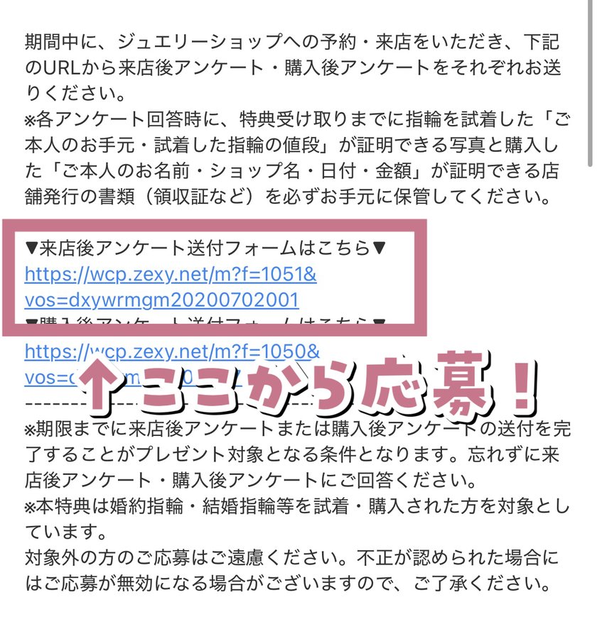 ちなみに、ゼクシィの指輪探しキャンペーンに応募するには、「来店後アンケート」や「購入後アンケート」と一緒に来店を証明する写真を添付する必要があります。